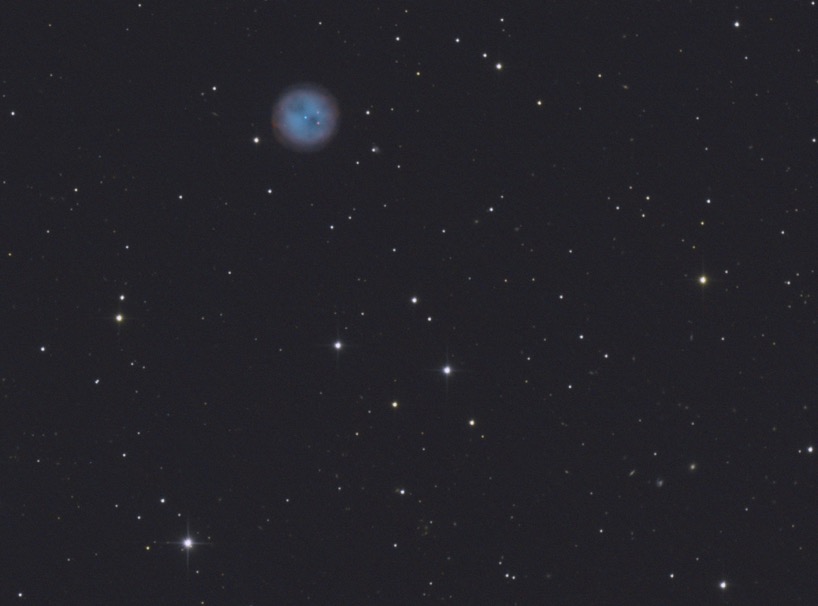 Viel Zeit bis zum Aufgang des Mondes blieb nicht mehr. Ich nahm mir deshalb den Planetarischen Nebel NGC1535 "Cleopatras Eyes" vor. Nachdem ich neulich mit dem Eskimonebel recht gute Erfahrungen gesammelt hatte wagte ich mich an dieses sehr kleine Objekt. Und: ich bin mit dem Ergebnis recht zufrieden.